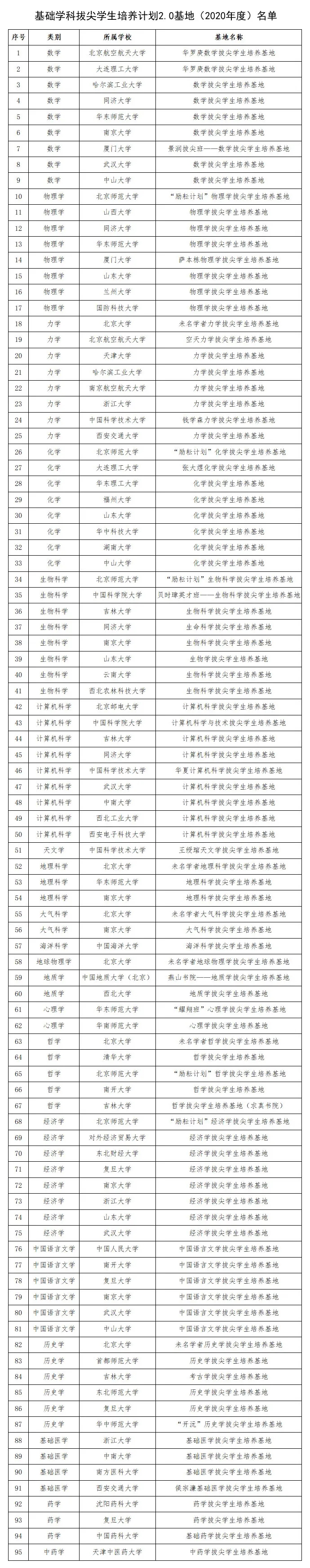 基础学科拔尖学生培养计划2.0基地(2020年度)名单