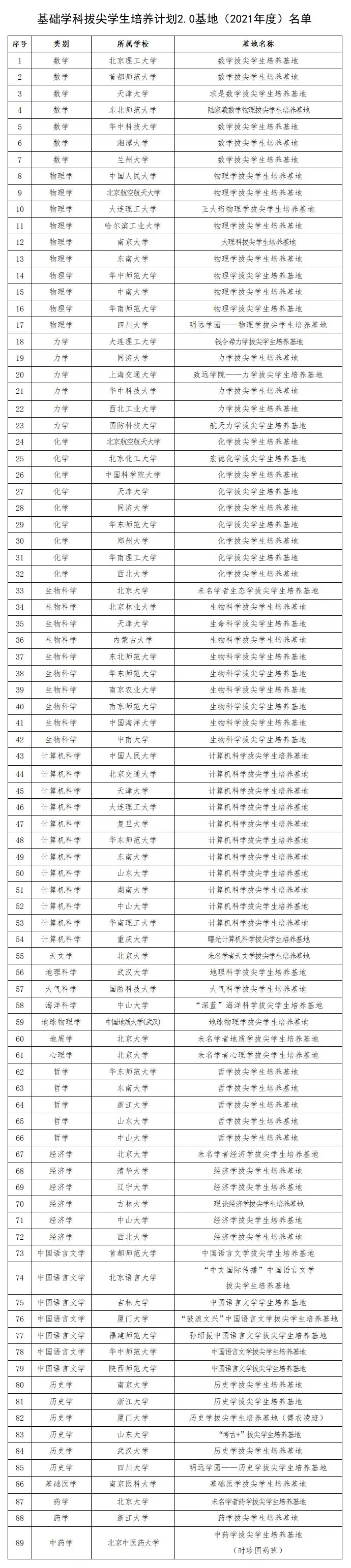 基础学科拔尖学生培养计划2.0基地(2021年度)名单