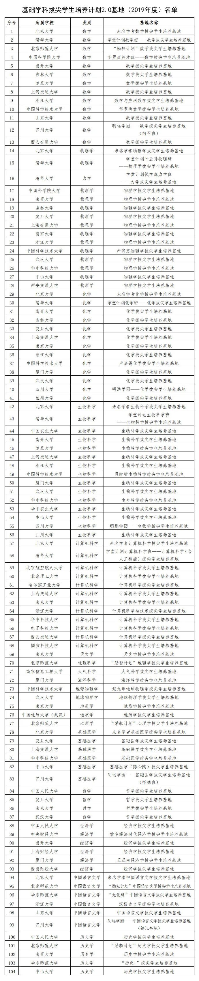 基础学科拔尖学生培养计划2.0基地(2019年度)名单