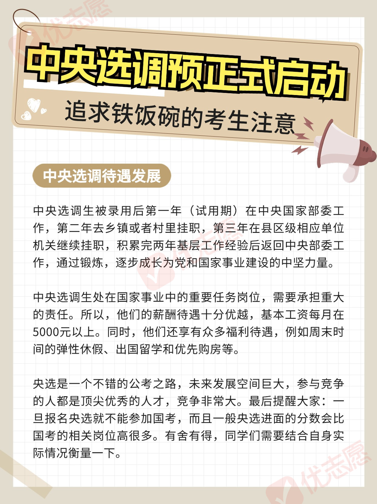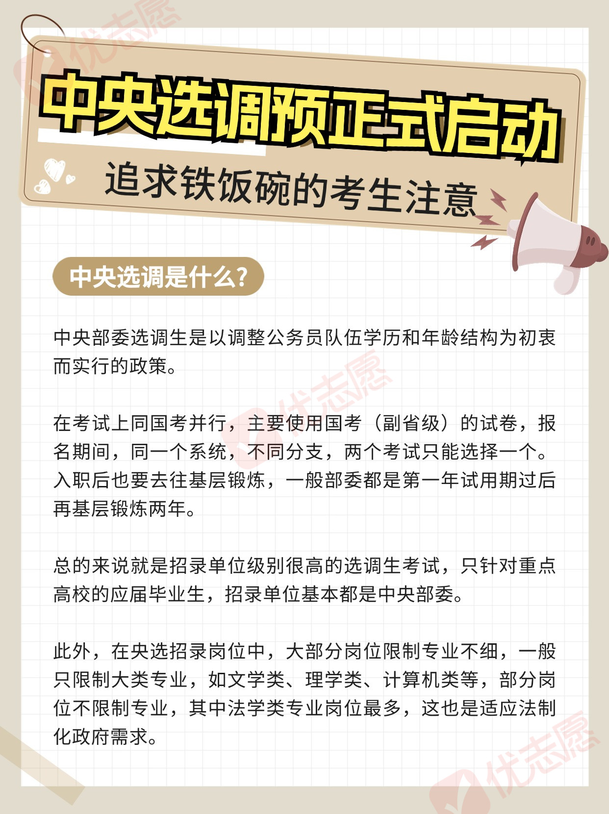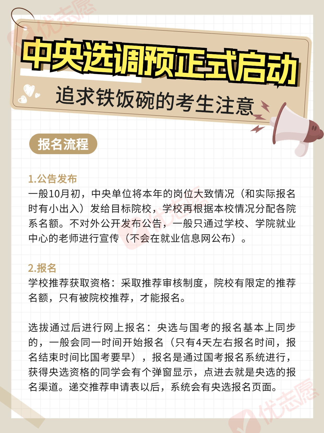 部分高校已接获关于2025届中央选调生招录的通知,并已启动校内选拔程序。想要毕业后成为公务员的学生注意,这是可以获得铁饭碗的途径之一,那么今天小优就跟大家分享一下!