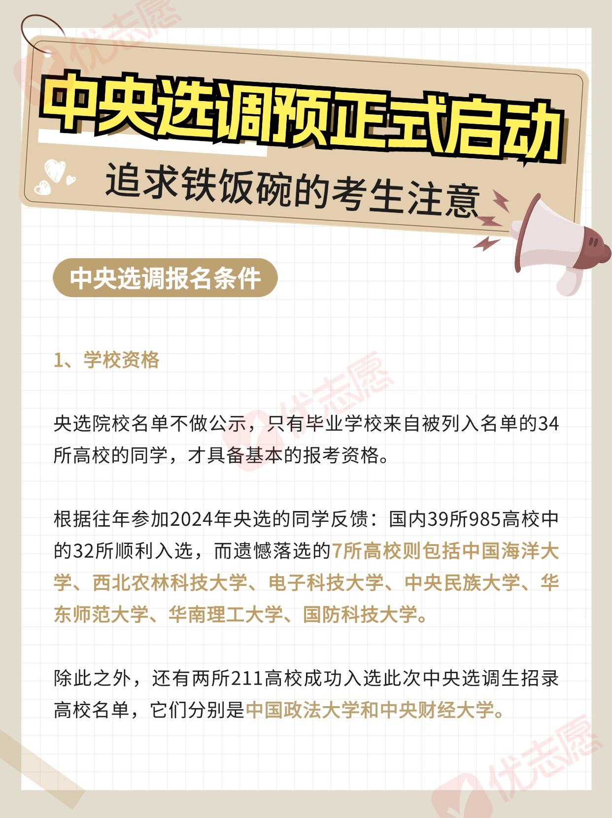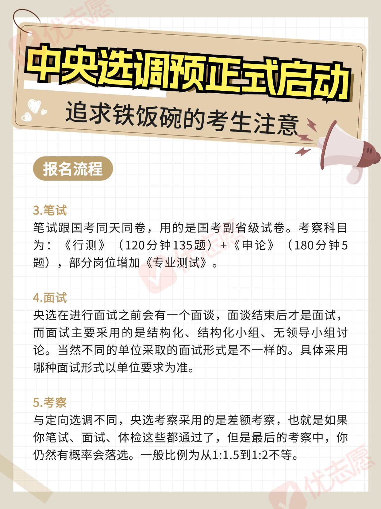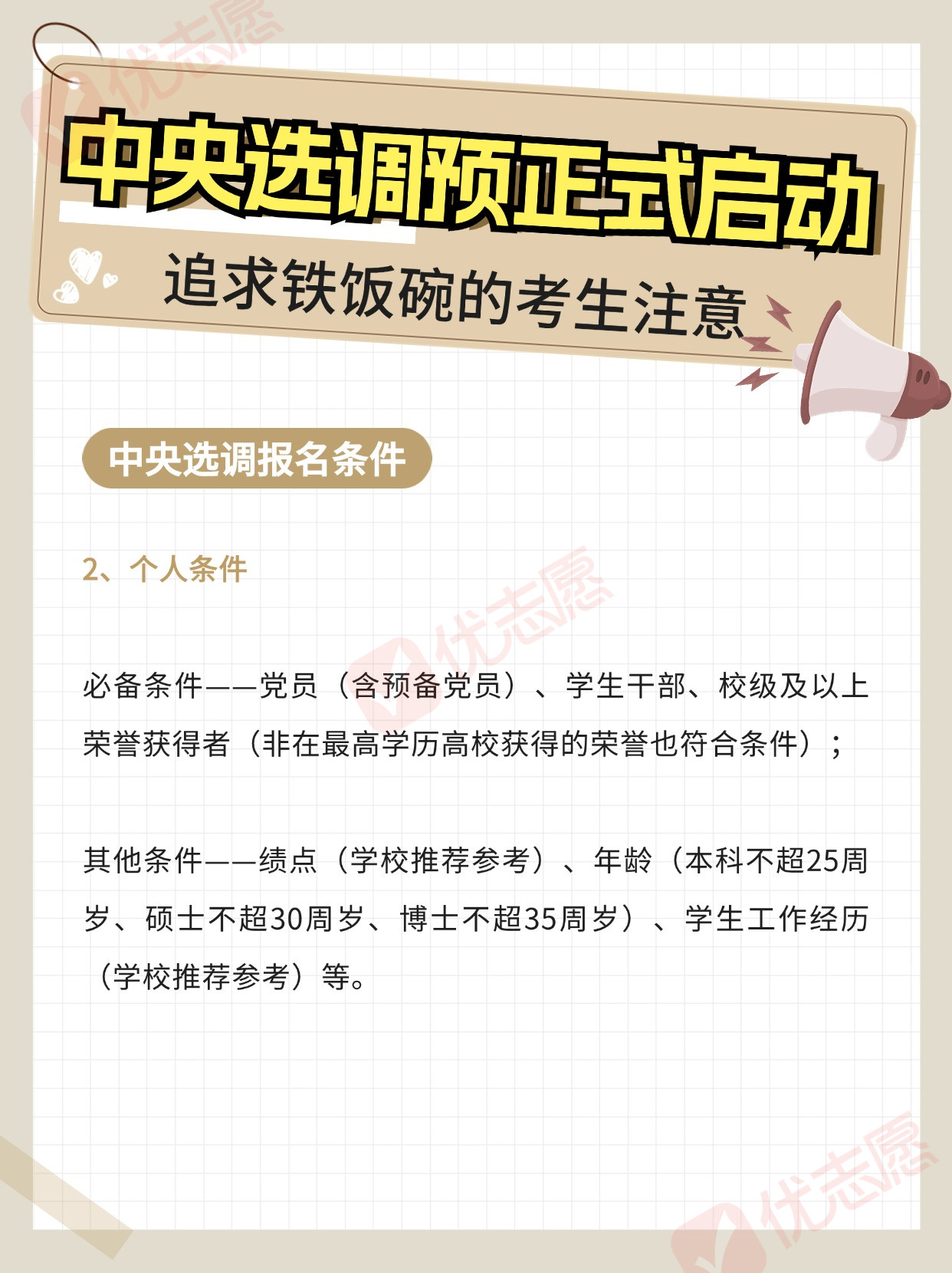 部分高校已接获关于2025届中央选调生招录的通知,并已启动校内选拔程序。想要毕业后成为公务员的学生注意,这是可以获得铁饭碗的途径之一,那么今天小优就跟大家分享一下!
