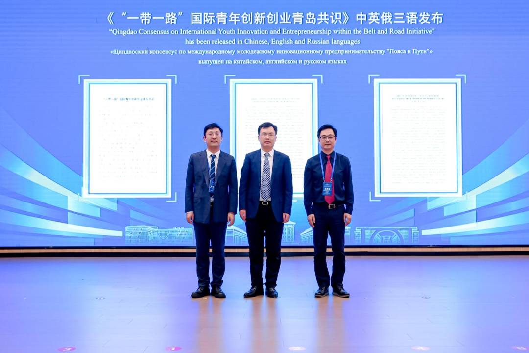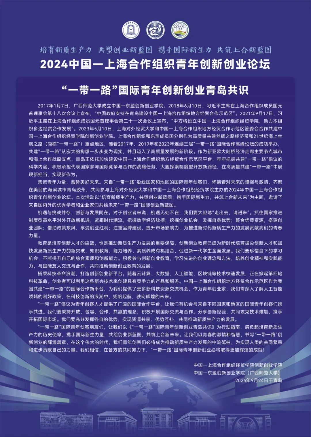 中国—上海合作组织经贸学院创新创业学院和中国—东盟创新创业学院正式发布了中英俄三语《“一带一路”国际青年创新创业青岛共识》,多方秉持开放、包容、合作、共赢理念,共同攻克技术难题,实现资源共享、优势互补,推动新质生产力加快发展。