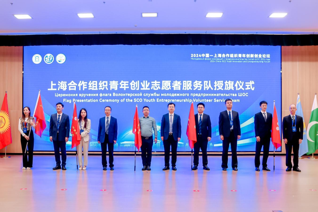 郑师、孙传奇、刘连新、张亚伟、高伟共同为上合组织青年创业志愿者服务队的代表授旗。据悉,上合组织青年创业志愿者服务队由创业导师、在校大学生、来华留学生、青年企业家组成,他们肩负着为创业者提供创业计划辅导、职业生涯规划、创业实践、创业孵化的职能。