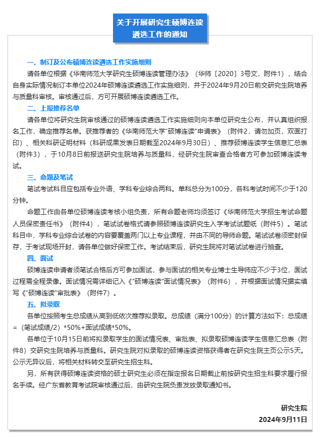 同时,华师还公布了2024年研究生研博连读遴选工作的通知。