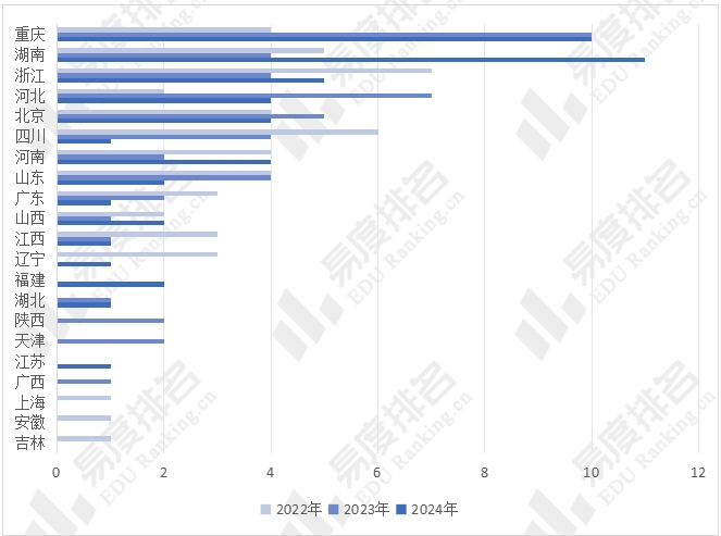 重庆生物奥林匹克竞赛实力在这三年中表现极为突出,金牌数量和总得分逐年增加,尤其在2023年从10枚金牌跃升至22枚。2024年继续保持领先,达到24枚金牌,同时银牌数量也增加。