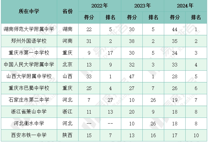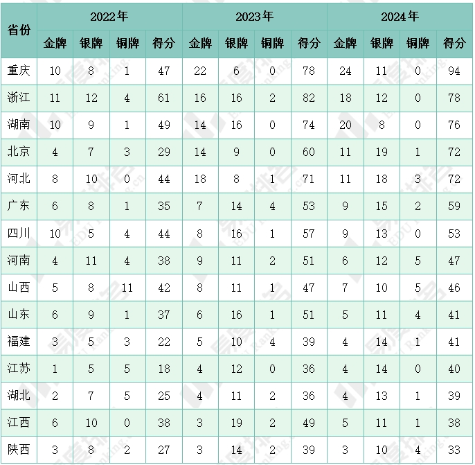 注:1.按2024年的得分、金牌数、银牌数、铜牌数排名;2.得分=金牌*3+银牌*2+铜牌*1