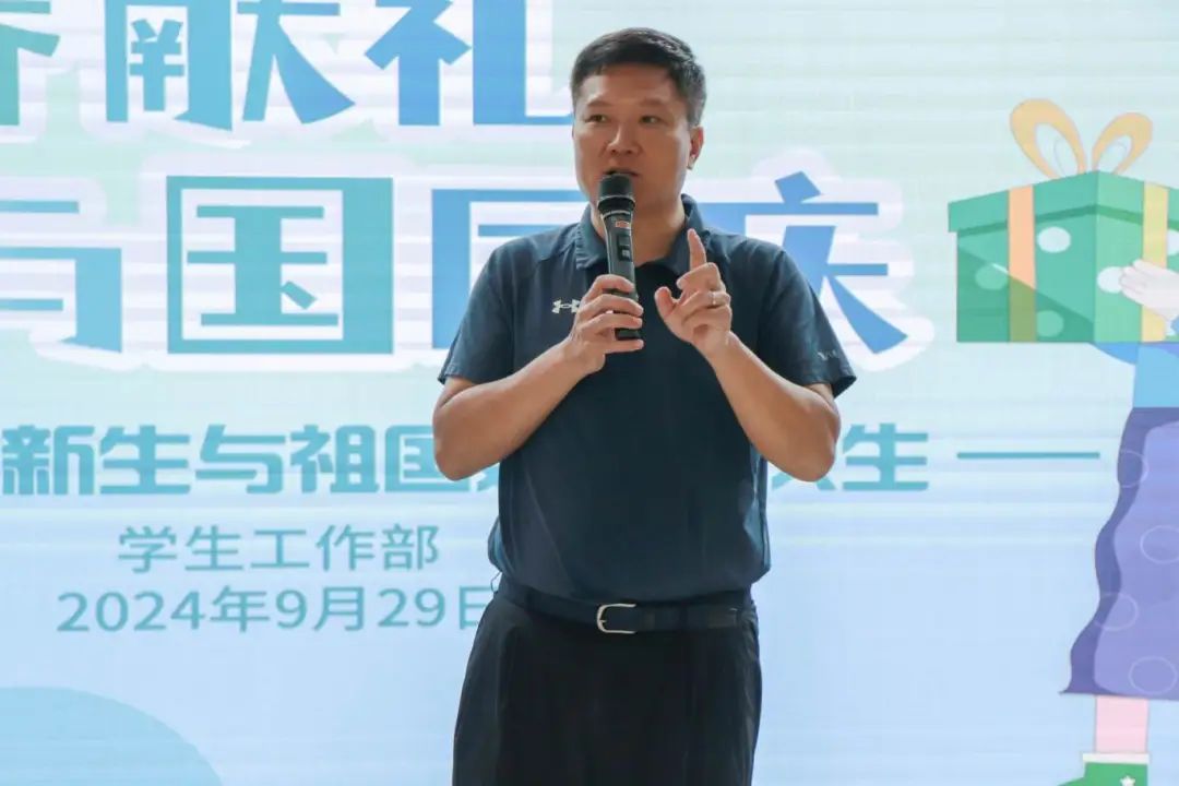 为了体现学校的人文关怀,帮助新生快速转换角色融入大学校园生活,在轻松愉快的氛围中促进师生交流,共度难忘时光,9月29日上午,学校在D11学生活动中心154路演厅举办主题为“青春献礼,与国同庆——2024级新生与祖国妈妈共庆生”的集体生日会,为新生送上美好祝福。学校党委副书记钟飞健,学生工作部部长祁伟鹏,团委书记王茗祎,学院的党委副书记、班主任、辅导员以及学工部的老师们出席本次活动.