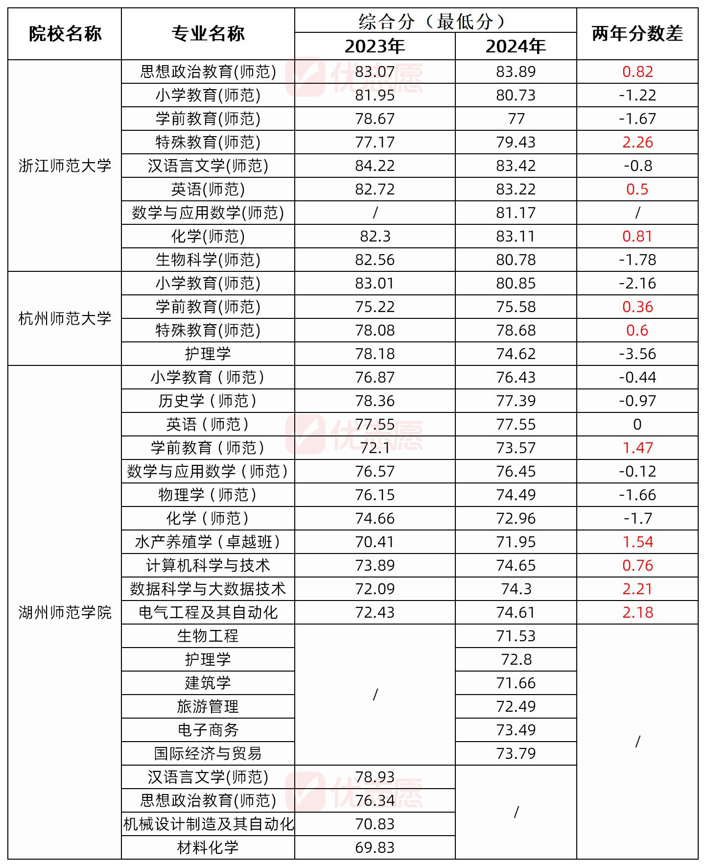 2024年,这三所师范大学综合评价共有30个专业招生,其中,有23个专业维持了与上一年的相同设置,可见这些专业在师范教育领域的稳定性和连续性。在这23个连续招生的专业当中,除了湖州师范学院的英语专业外,其余专业的综合分录取分数线相较于去年均有所调整,各校综评专业的分数线差保持在4分以内,整体变化幅度相对较小。