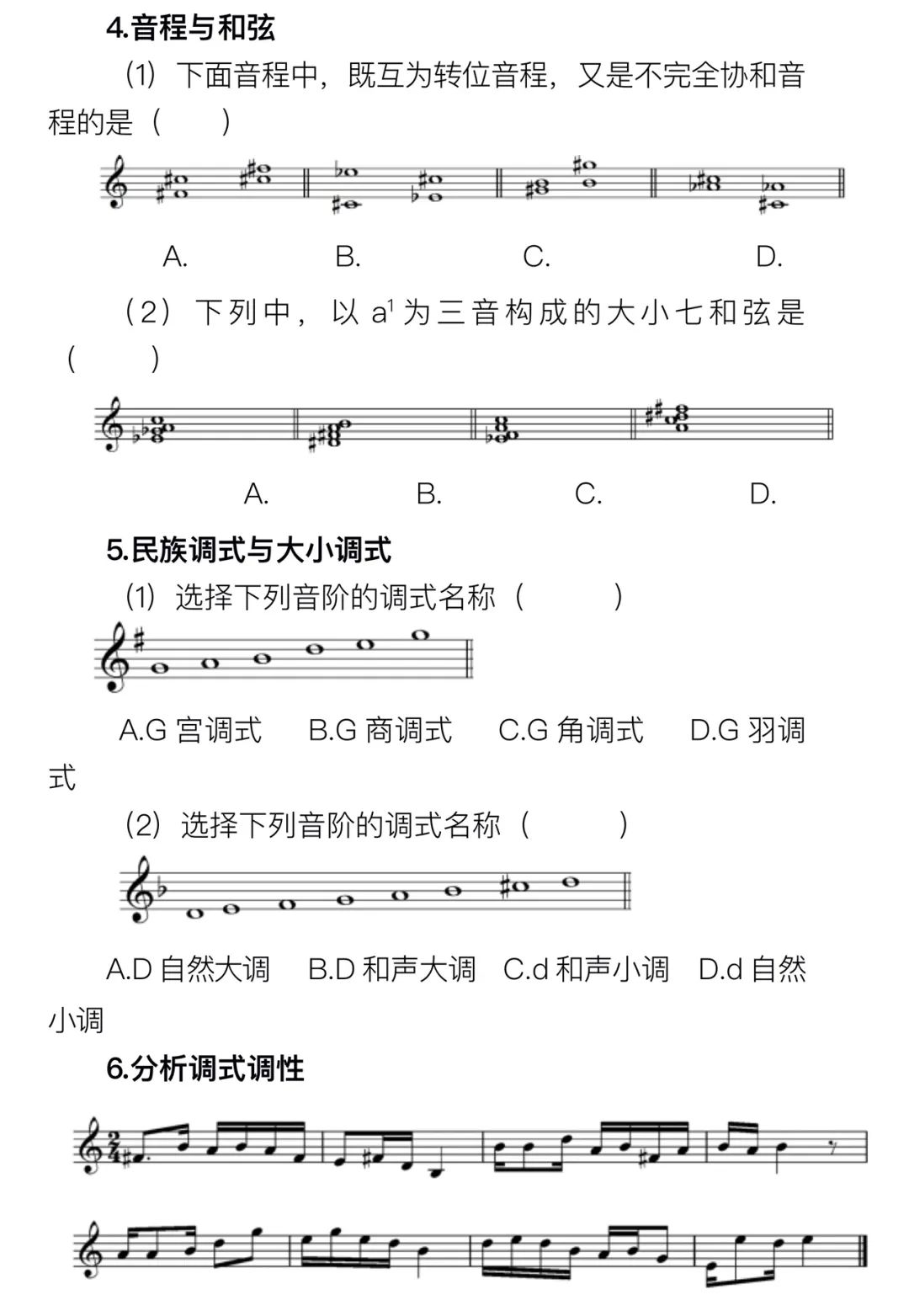 2.考试内容:音与音高、音长与节奏、常用乐谱符号、音程与和弦、民族调式与大小调式。