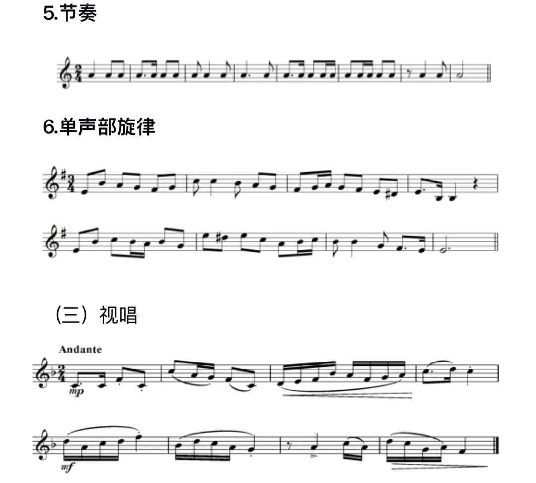 3.考试形式:开始前提供标准音a1,考生一遍完成视唱。视唱过程中无任何音响提示。