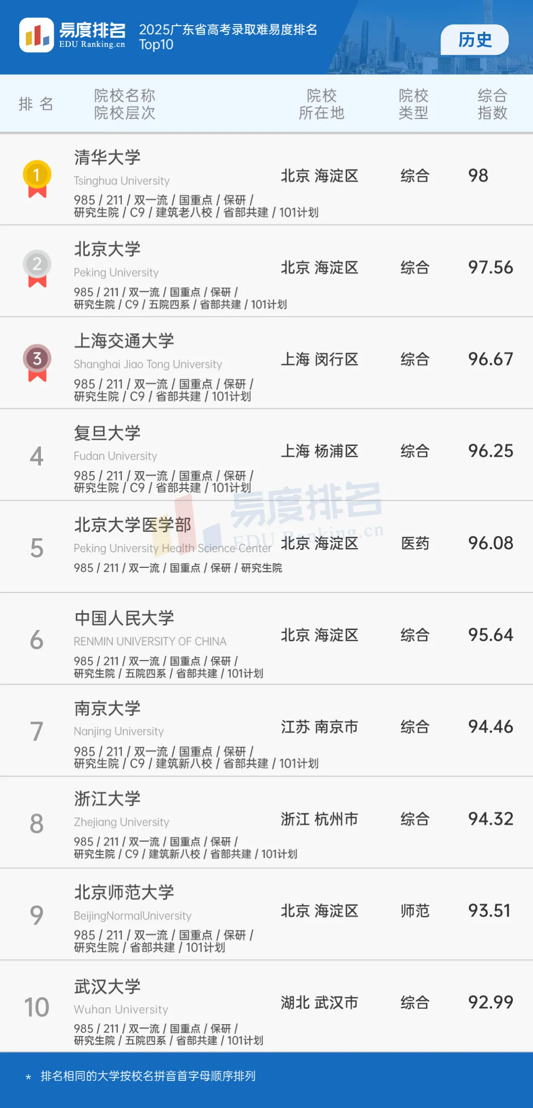 “2025广东省高考录取难易度排名(历史)”的对象是中国756所本科级院校。为合理展示各大学的排名,易度将其从院校性质和类型上划分为综合性大学和12类单科性大学。