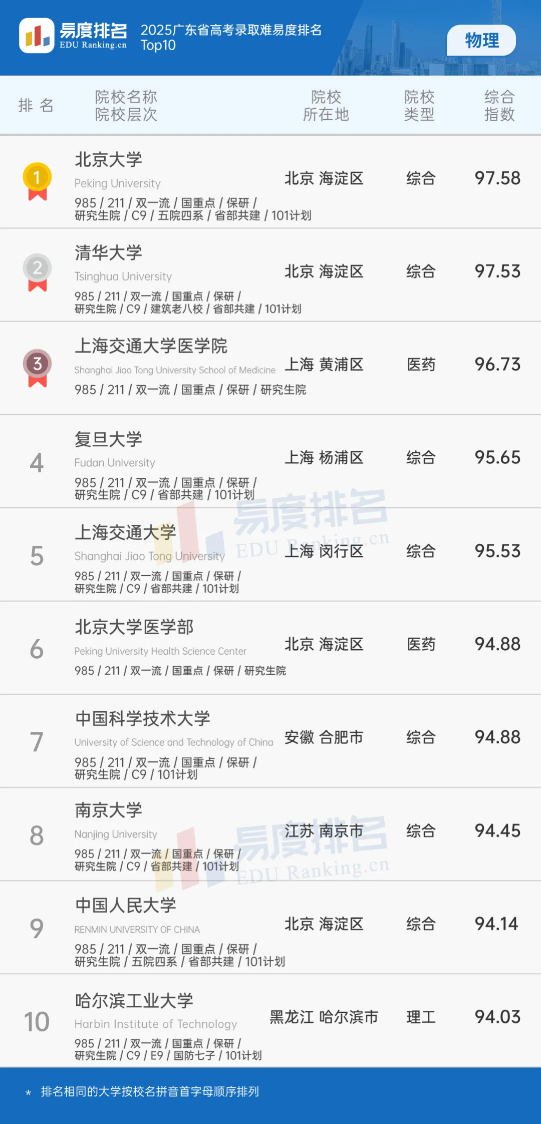 “2025广东省高考录取难易度排名(物理)”的对象是中国940本科级院校。为合理展示各大学的排名,易度将其从院校性质和类型上划分为综合性大学和12类单科性大学。