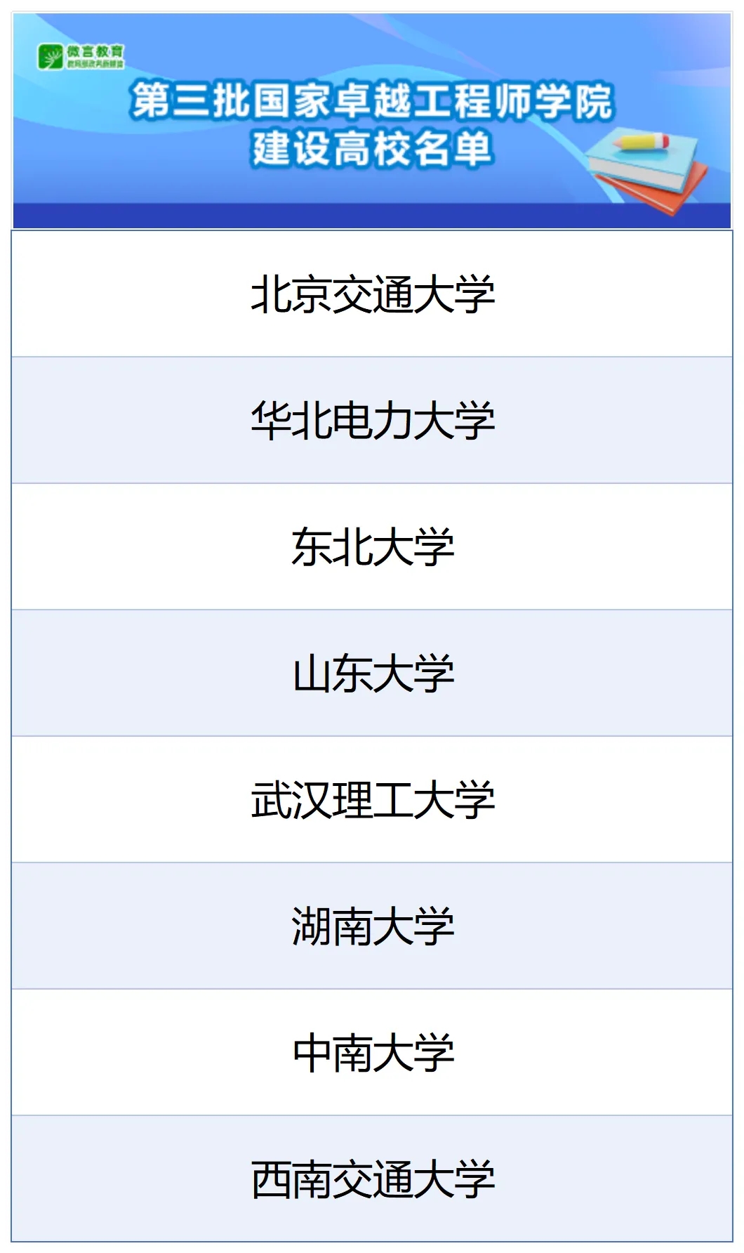 根据《教育部办公厅 国务院国资委办公厅关于支持部分高校和中央企业试点共建国家卓越工程师学院的通知》,经商国务院国资委,教育部决定支持部分高校与企业共建第三批国家卓越工程师学院。近日,教育部公布第三批国家卓越工程师学院建设高校名单,一起来看: