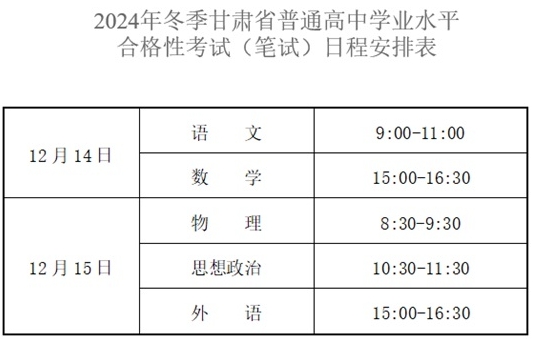 原定此时段举行的2024年冬季甘肃省普通高中学业水平合格性考试(笔试)延迟至2024年12月14日-15日举行,信息技术科目机试时间不变,原报名缴费等信息继续有效。因延迟考试给广大考生带来的不便,敬请谅解!