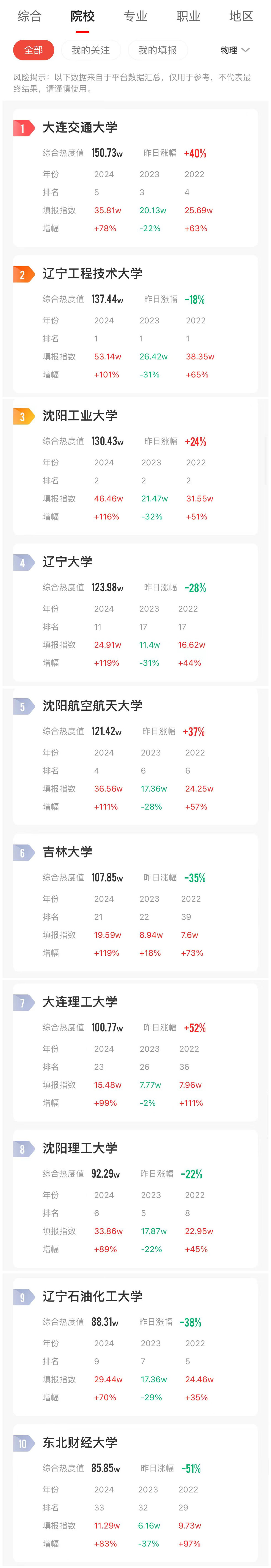 值得注意的是,除了吉林大学这一外省市高校跻身前十外,其余九所院校均为辽宁本土院校,它们分别是:以理工科见长的大连交通大学、沈阳工程技术大学、沈阳工业大学、沈阳航空航天大学、大连理工大学、沈阳理工大学以及专注于石油化工领域的辽宁石油化工大学;另综合类院校辽宁大学和财经类东北财经大学同样表现出色,在众多考生及家长心中占据了一席之地。这一分布格局清晰地反映出,辽宁考生及家长在择校时,更倾向于选择本省的高等学府,而在本省院校中,理工类院校以其鲜明的专业特色和强大的就业竞争力,赢得了考生的广泛青睐。