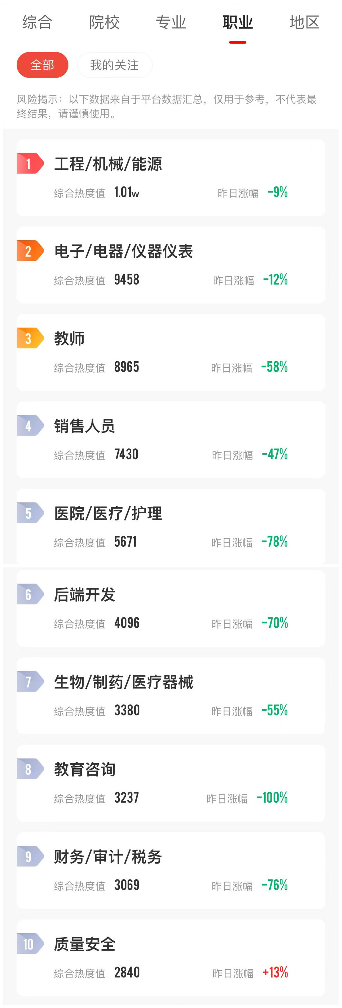 从职业热度榜整体情况来看,考生们的职业选择倾向正发生显著变化,他们愈发倾向于关注那些技术性强、市场需求旺盛的行业。具体而言,工程/机械/能源以及电子/电器/仪器仪表等领域,凭借其深厚的专业技术底蕴与光明的就业前景,成为了考生们竞相追逐的热门选项。与此同时,教师职业则以其稳定的职业前景与社会价值,赢得了众多求职者的青睐,位列第三。此外,销售人员凭借其灵活的就业形式与广阔的发展空间,也跻身榜单前列!