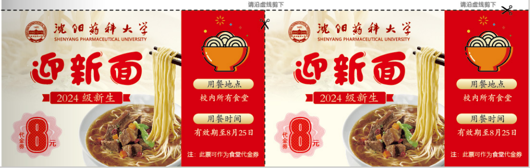 沈药在录取通知书中附赠了“迎新面”餐券,新生可以在食堂使用餐券,根据个人的饮食习惯和口味换取一份属于自己的“下车面”,体会家的温暖。