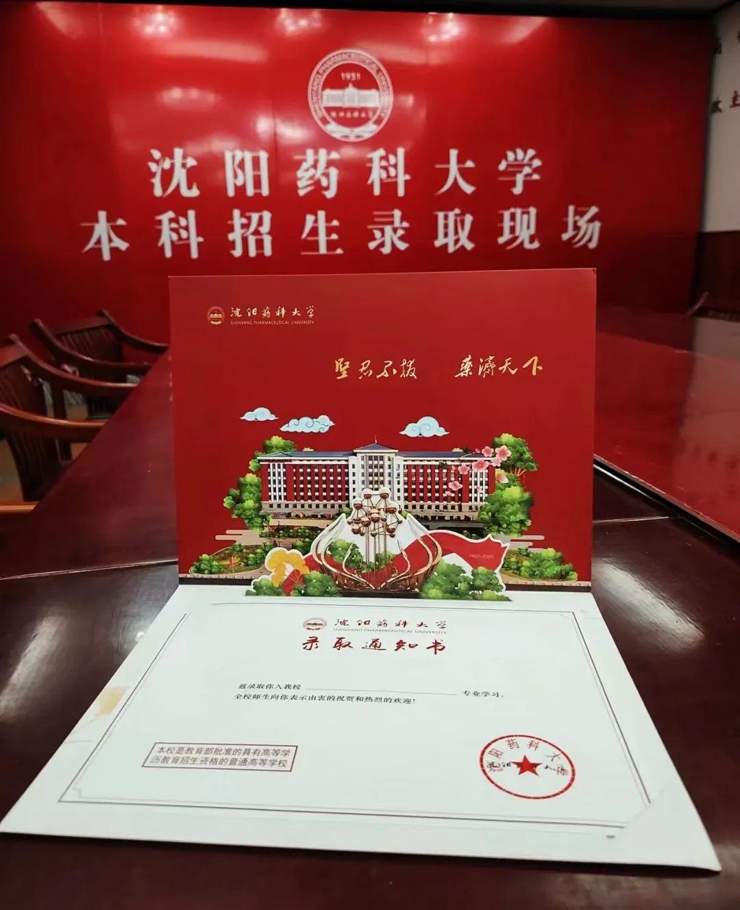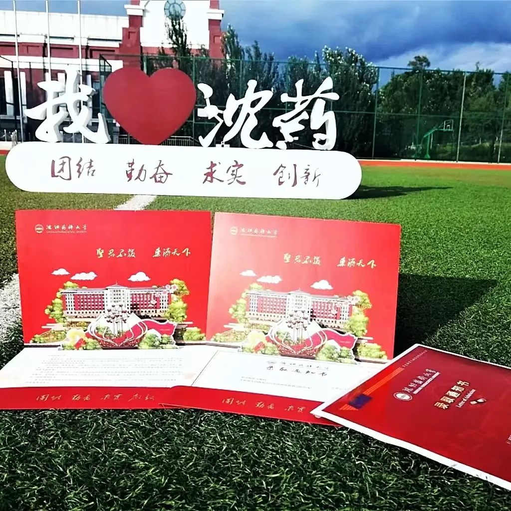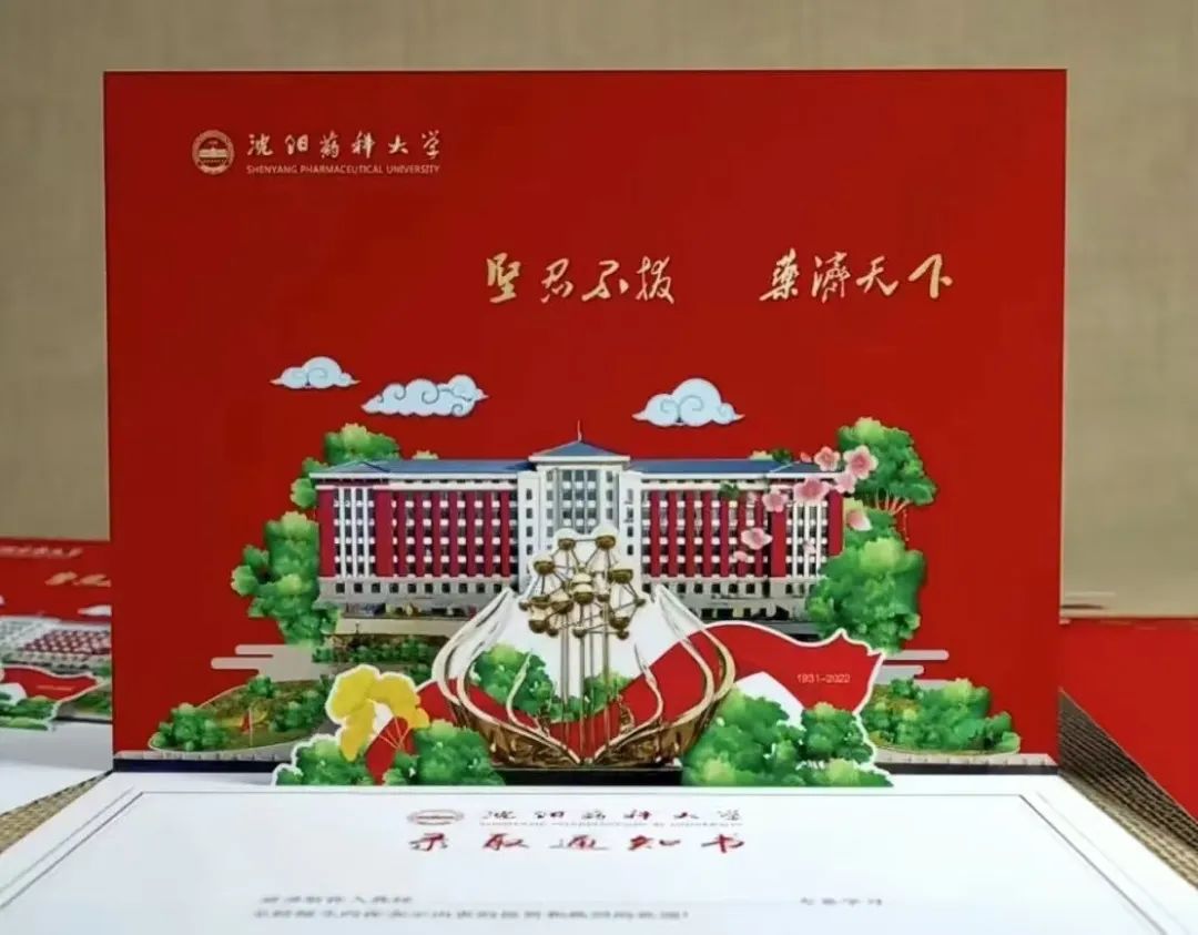 通知书的整体设计简洁大气,却又不失精致典雅。以沈药红为主色调,象征着热情与活力,祝贺同学们正式成为一名沈药人,开启医药报国的崭新征程。