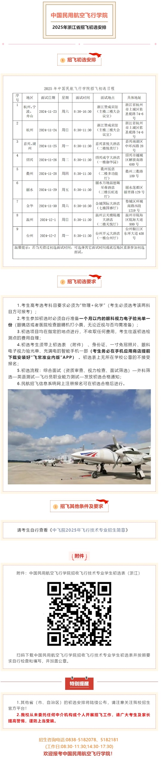 中国民用航空飞行学院2025年浙江省招飞初选安排