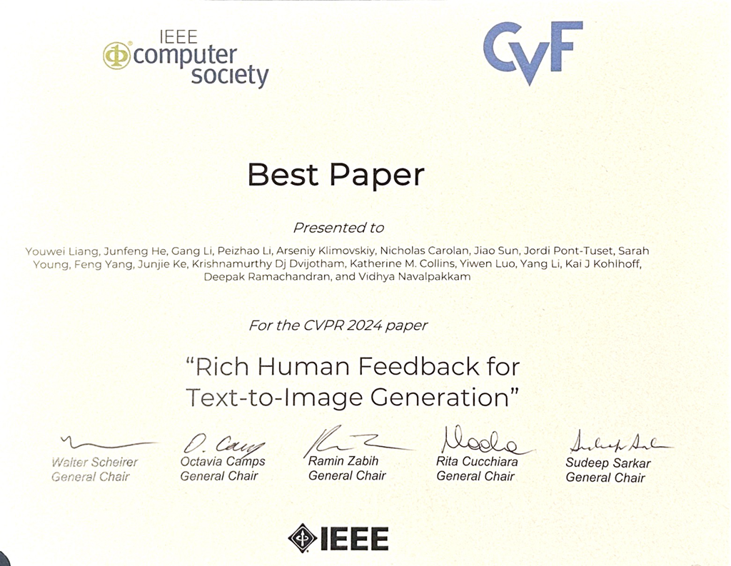 经过严格评选与激烈竞争,最终有2篇论文获最佳论文奖,2篇论文获最佳学生论文奖。我校毕业生梁有为目前博士就读于加州大学圣地亚哥分校,其作为第一作者的获奖论文《Rich Human Feedback for Text-to-Image Generation(为文本到图像生成提供丰富的人类反馈)》由加州大学圣地亚哥分校、谷歌研究院、南加州大学、剑桥大学及布兰迪斯大学合作发布。获最佳论文奖的还有谷歌研究院发布的《Gnerative Image Dynamics(生成图像动力学)》。