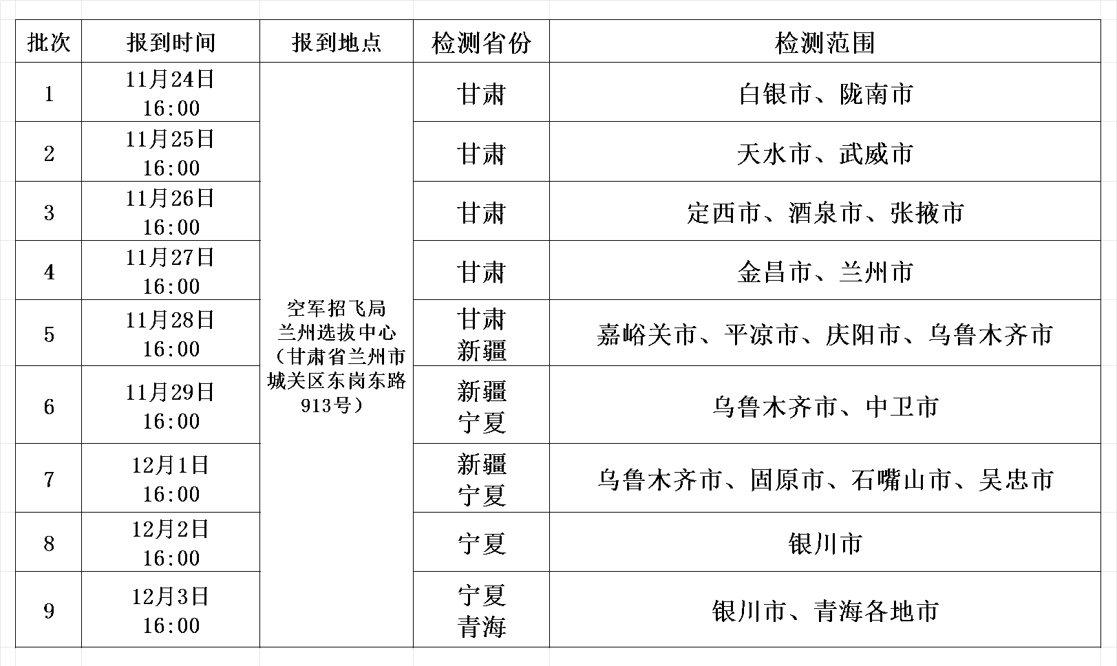 根据空军招飞年度工作安排,2025年空军招飞甘肃、青海、宁夏、新疆(乌鲁木齐)复选检测将于2024年11月24日—12月3日在兰州招飞中心进行。参检学生请认真阅读此文,做好检前准备工作。