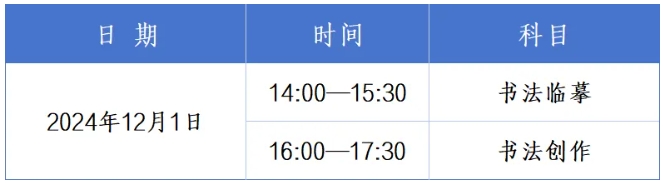 3.开考15分钟后,考生不得进入考点参加相应科目考试。书法临摹考试结束前15分钟内方可交卷,交卷后不允许出场,不得接触手机等违规物品。书法创作考试结束前30分钟内方可交卷出场,交卷出场后不得再进场续考,也不准在考场附近逗留或交谈。