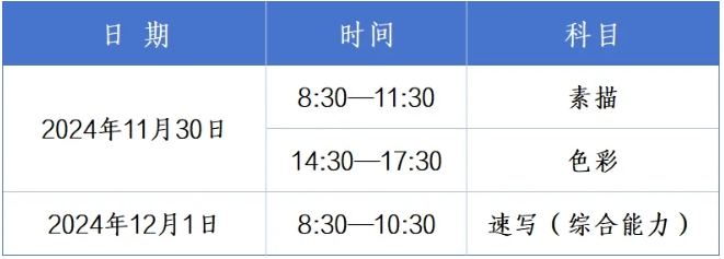 2.考生只能携带规定的考试用品参加考试:0.5mm黑色墨水签字笔,黑色铅笔、炭笔、水粉、水彩、丙烯颜料、钢笔、马克笔、蜡笔、彩色铅笔、铅笔刀、橡皮擦(电动橡皮除外)、透明胶带、大小不超过4K且双面平整的画板等