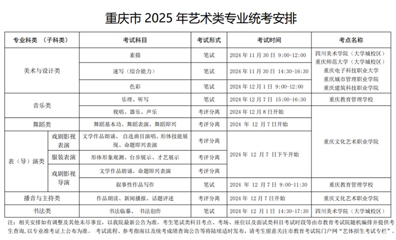 重庆市2025年艺术类专业统考安排