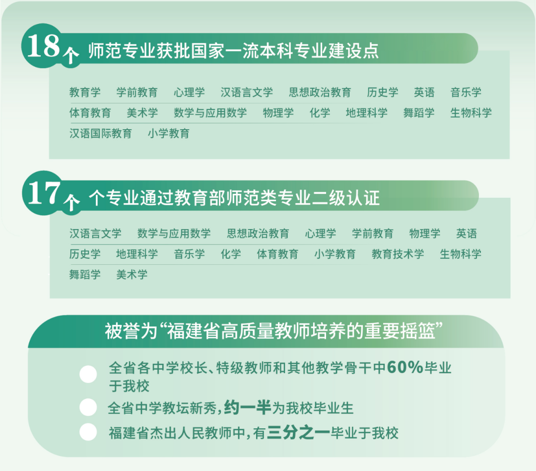 十年树木、百年树人,悠悠百载、弦歌不辍。学校扎根八闽大地,始终将培养高素质师资为己任,不断强化教师教育的传统“底色”和时代“亮色”。经过百年沉淀,学校现有19个师范类本科专业,18个师范专业获批国家级一流本科专业建设点,17个专业通过师范专业二级认证;本科招生计划约占全部招生计划的36%,实现学前、小学、中学师资培养全覆盖。