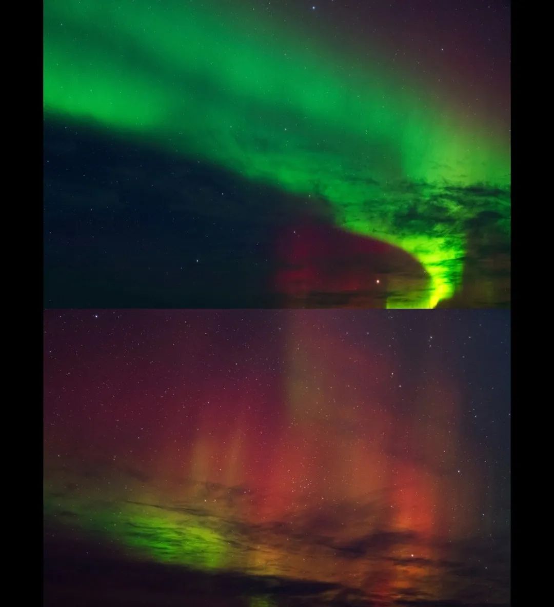 极光变化的速度远超我们的想象,眨眼之间,天上出现了一道由极光光带组成的巨大拱桥,横跨两侧的地平线,红色、黄色、绿色的极光快速舞动着。极光拱桥也从一道分离出两道、三道。地平线东侧的极光,拖着一条很亮很粗的尾巴和一条很细稍暗的尾巴;而地平线西侧的则聚集成团状,比银河的中心还要亮很多。我兴奋地将相机对准天空各处,捕捉着太阳风和地球磁场带给我们的视觉盛宴。