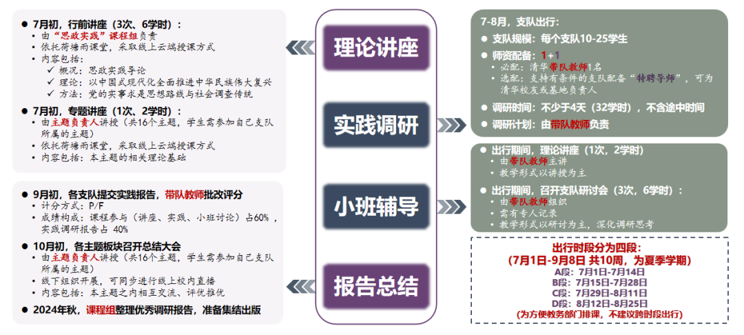 新版“思政实践”课的培养环节遵循严密的“闭环原则”,系统整合各级资源做好前期课程筹备,在教学环节设置理论讲座、实践调研、小班辅导、报告总结四个阶段,循序渐进带领学生走出“思政小课堂”、走入“社会大课堂”。