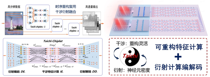 团队以周易典籍‘易有太极,是生两仪’为启发,建立干涉-衍射联合传播模型,融合衍射光计算大规模并行优势与干涉光计算灵活重构特性,将衍射编解码与干涉特征计算进行部分/整体重构复用,以时序复用突破通量瓶颈,自底向上支撑分布式广度光计算架构,为片上大规模通用智能光计算探索了新路径。