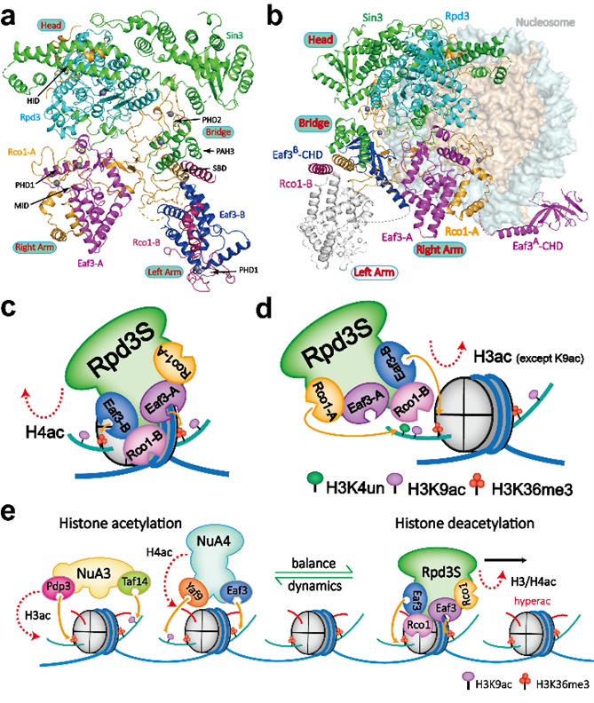 表观遗传是确保表型多样性的关键机制。组蛋白去乙酰化酶Rpd3是一类全局基因调控和共抑制因子,人源Rpd3S复合物的功能异常与肿瘤、心血管疾病发生相关,是重要的药物靶点。团队通过