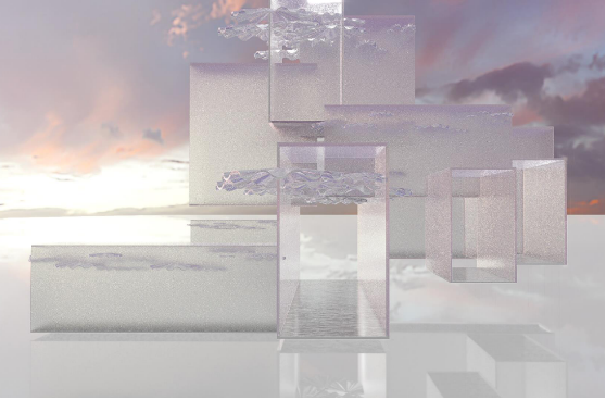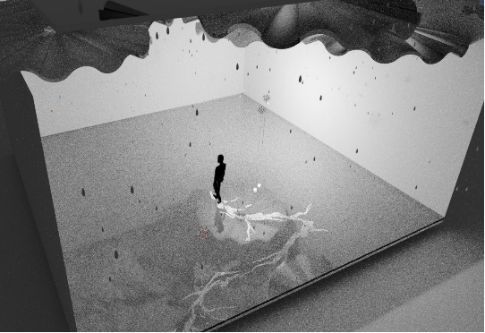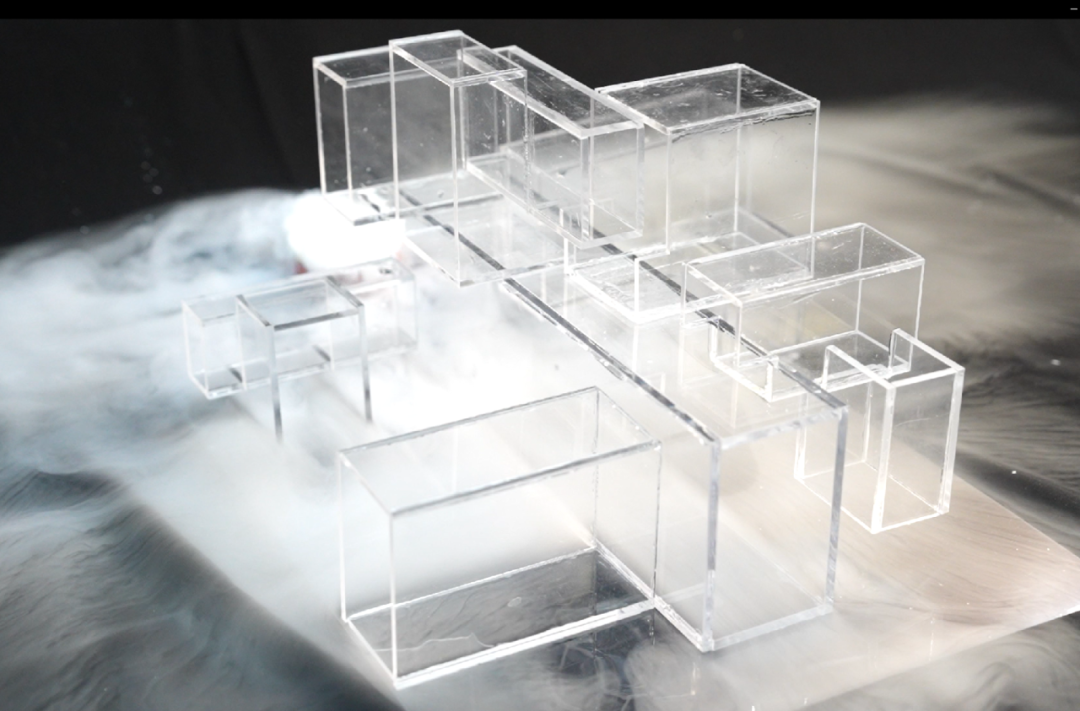作品用磨砂镜子材质的屋顶表现山荷叶的质感。无人时,雨帘装置模仿降雨,可渗水材料模拟的地面呈透明效果;有人踏过时,雨帘停止降水,地面上留下的白色行迹宛如舒展的叶脉。高频闪烁的照明灯还能造就“雨水倒流”的视错觉,引出时光回溯的意蕴。