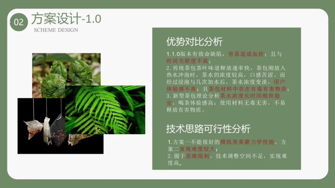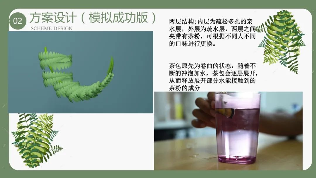 在为先书院副院长王秀梅、材料学院副研究员孙晓丹、邱松等老师的共同帮助下,小组从思维堵点迎难而上,从0.0、0.1版本的水凝胶递送系统,步步迭代到以荚果蕨叶片的卷曲和展开为灵感设计的1.0、2.0版本“茶包”。这个取名为“裹茶蕨蕨子”茶包,可以随茶水冲泡逐层展开、在较长时间内保持茶味浓郁。