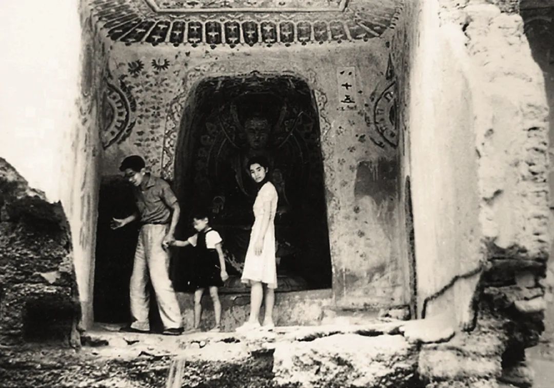 一家三口在莫高窟洞内