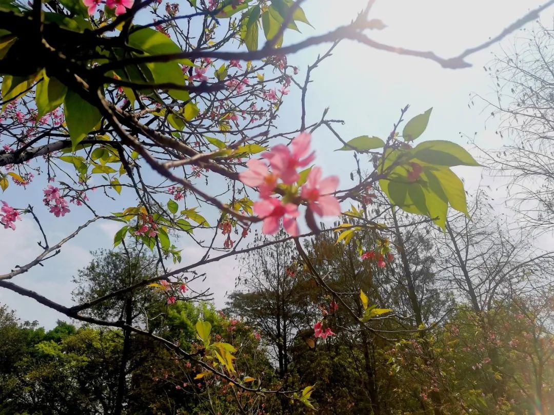 蓝天是映衬那株粉花最好的背景,绿色的枝叶盘旋画本笼罩新的春花