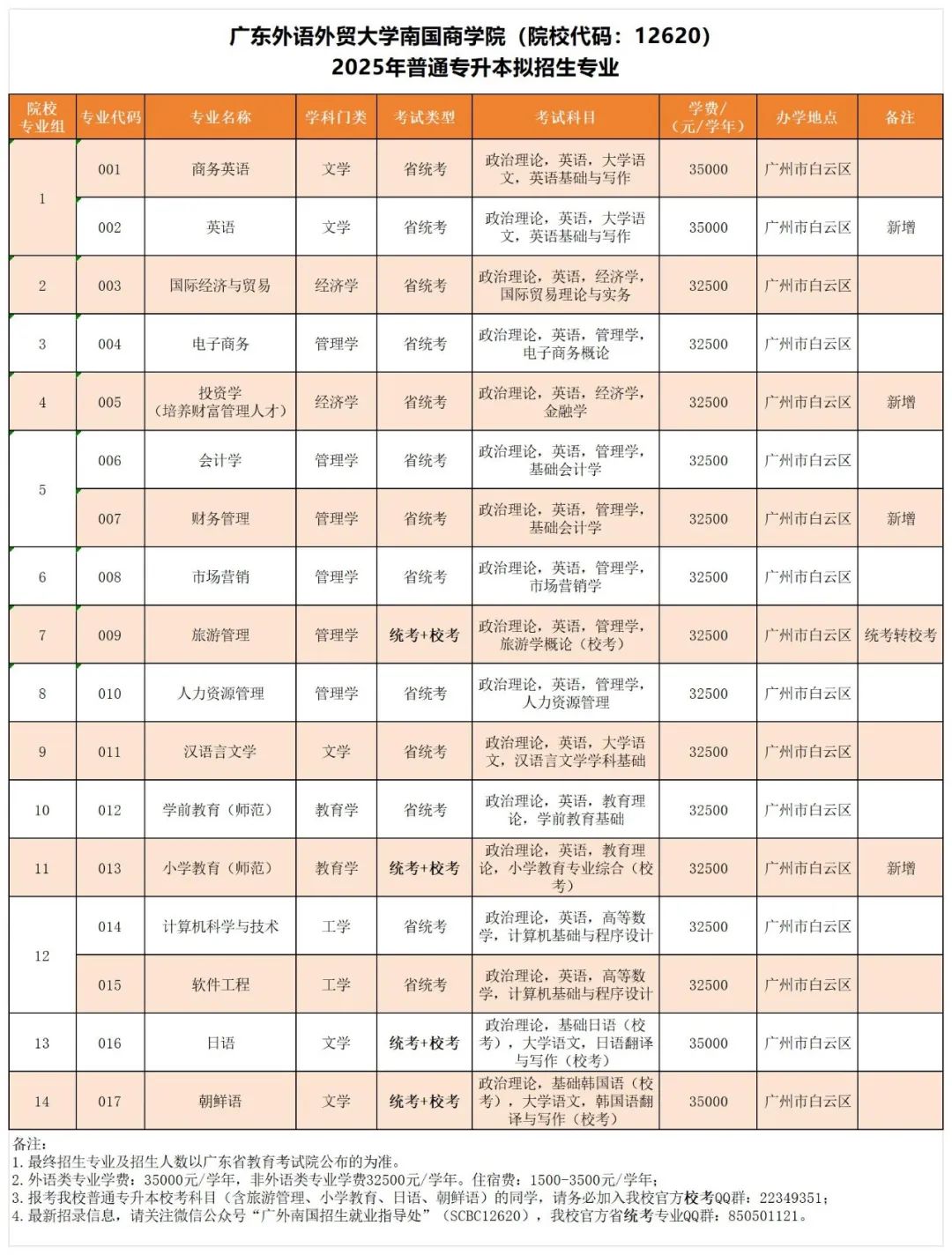 广东外语外贸大学南国商学院新增4个本科专业我校2025年普通专升本拟计划招生专业17个,新增英语、投资学(培养财富管理人才)、 财务管理、小学教育(师范)等4个本科专业,旅游管理专业由原来的省统考调整为统考+校考。2025年普通专升本拟招生专业(最终招生专业、考试科目以广东省教育考试院公布为准)