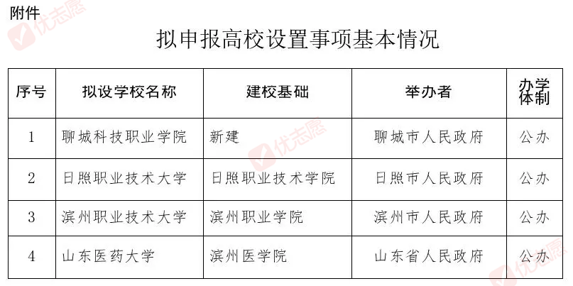 12月2日,山东省教育厅发布关于聊城科技职业学院、日照职业技术大学、滨州职业技术大学、山东医药大学4所拟申报高校设置事项予以公示的通知。据介绍,4所院校均为公办。