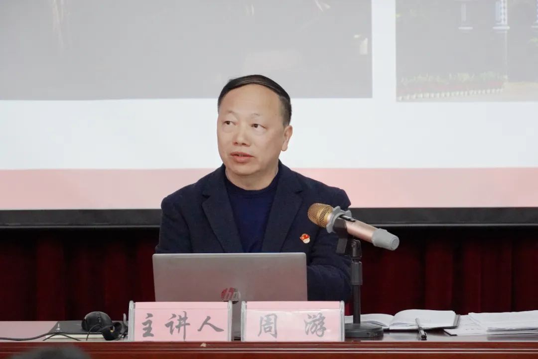 周游以长征视频回顾和毛泽东诗词为例,生动引入主题,分享长征的宝贵精神财富。他结合长征第一渡、血战湘江、遵义会议、四渡赤水、胜利大会师等著名历史事件,带领全体师生共同回顾长征从起源到转折,最后走向胜利的艰苦奋斗史,诠释了中国共产党战无不胜的信仰。他结合红军事迹,深入解释了长征精神的深刻内涵、历史意义,指出长征是中华民族不屈不挠精神的典范,是人类历史上艰苦奋斗精神的楷模,是充满着无私奉献精神的史诗。他要求,学校广大师生在长期学习长征的历史、精神、意义的过程当中,要用于心、记于脑,在实践当中不断践行伟大的长征精神。