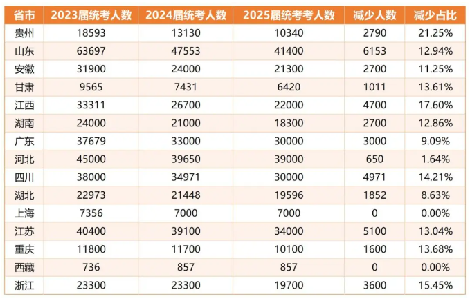 除了山东外,如贵州从2023年的18593人下降到 2025年的 10340人,减少了8253人,减少占比达到21.25%,这些