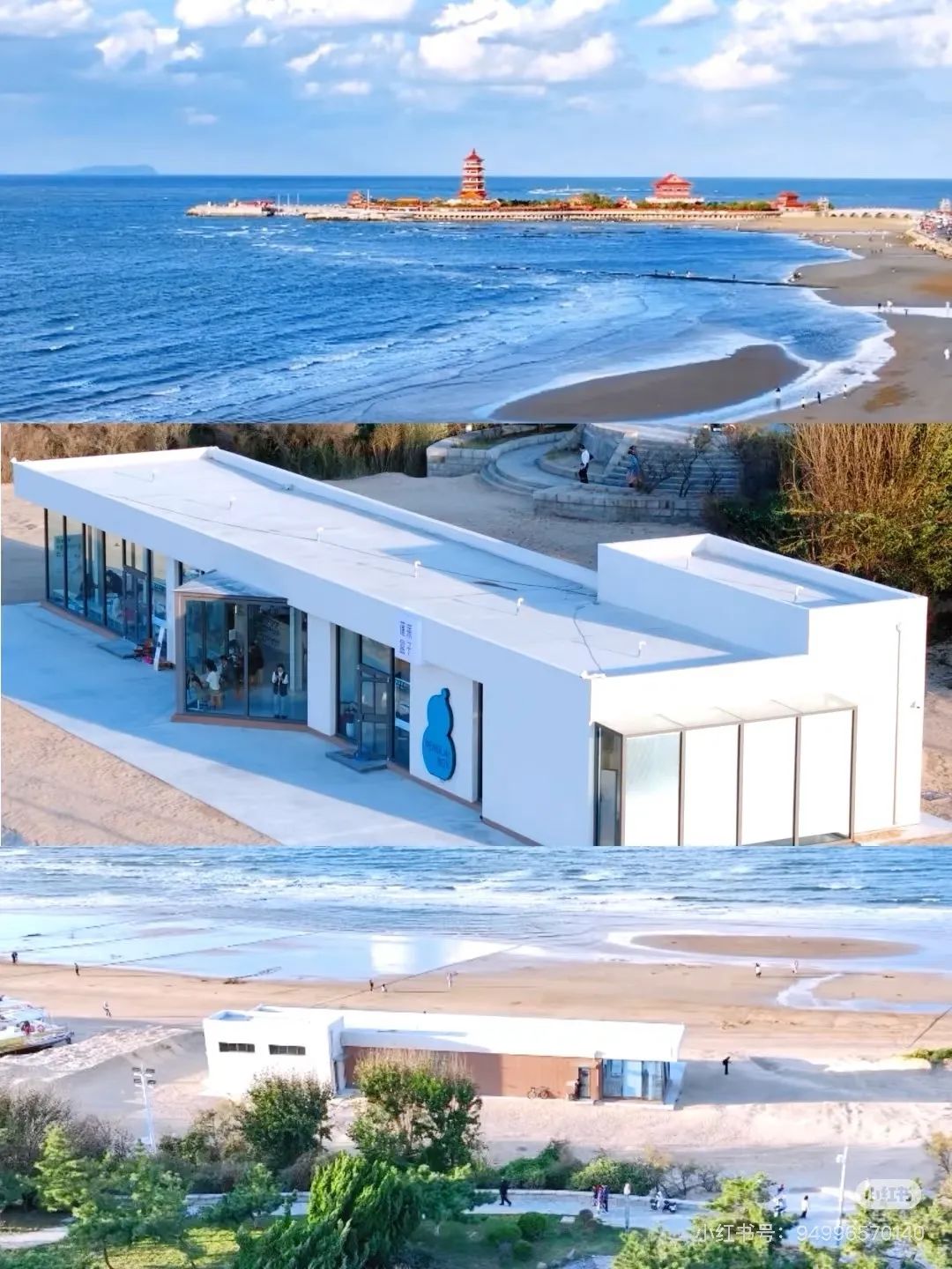 位于蓬莱海水浴场是建在沙滩上的一个“巨大盒子”对面是无边际的湛蓝大海脚下是柔软舒适的沙滩在这儿可以感受极致的滨海浪漫