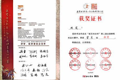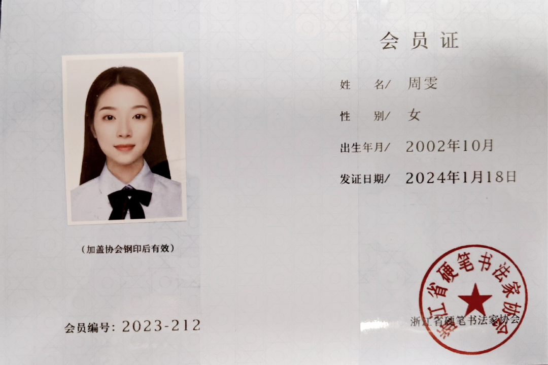 Calligraphy is the integration of ink and the soul, and for her, it is also the process of her words dancing on paper. During her college years, she participated in numerous calligraphy competitions, and on multiple occasions, she represented Wenzhou Business College to win national gold medals, provincial first prizes, and third prizes, surpassing institutions such as China Academy of Art and Zhejiang University. Through her continuous efforts, she has become a member of the Zhejiang Calligraphers Association.