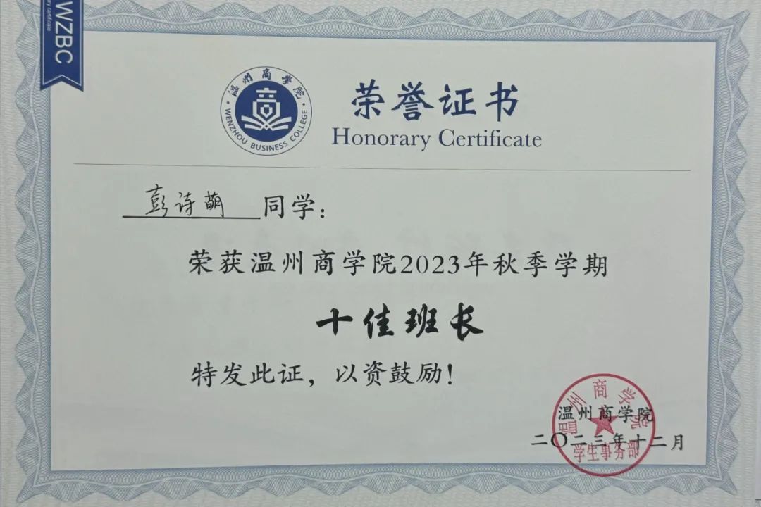 在求知的漫漫征途上,彭诗萌恰似一位执着的攀登者,始终以炽热的激情和专注的态度,向着知识的高峰奋勇前行。她以令人瞩目的4.24高绩点,傲然屹立于专业前沿,荣获国家奖学金。然而,对她而言,这并非终点,而是全新征程的起点。她引领温商团队在“海豚看世界” 温州市青少年网络传播活动暨模拟联合国会议中斩获十佳组织奖,个人也收获最佳文件奖、外研社・词达人校赛特等奖以及第 29 届中国日报社 “21 世纪杯” 全国