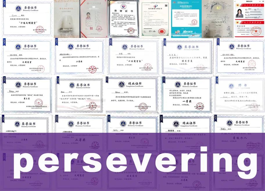 她精益求精、力争上游。作为班级的心理委员,她还担任23级校学生通讯社办公室的干事,勤勉尽责地投身于各类竞赛与实践活动中,党务工时累积超过60小时,充分展现了她的奉献精神和组织能力。她曾荣获省政府奖学金,印象温州