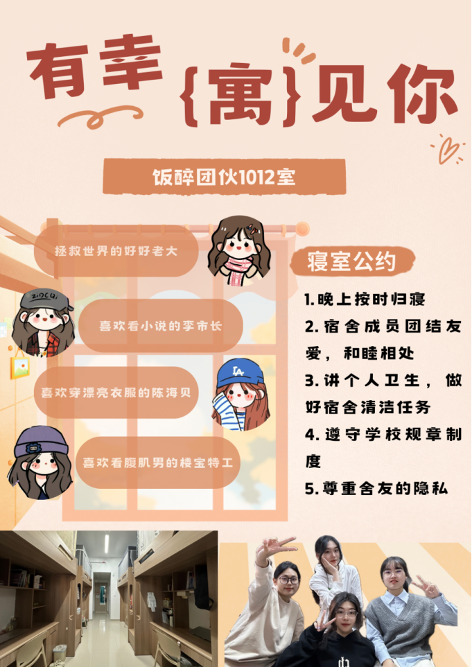 四个心怀梦想的灵魂在这里碰撞,编织着属于她们的温暖与力量,她们坚信一个人的努力是加法,团队的力量是乘法,学业中互为灯塔,生活中共筑暖巢,彼此的善意与成长如春水般温润,将日常化作诗篇,将梦想植入彼此心间。在这方小屋里,友情不息,光芒不灭。