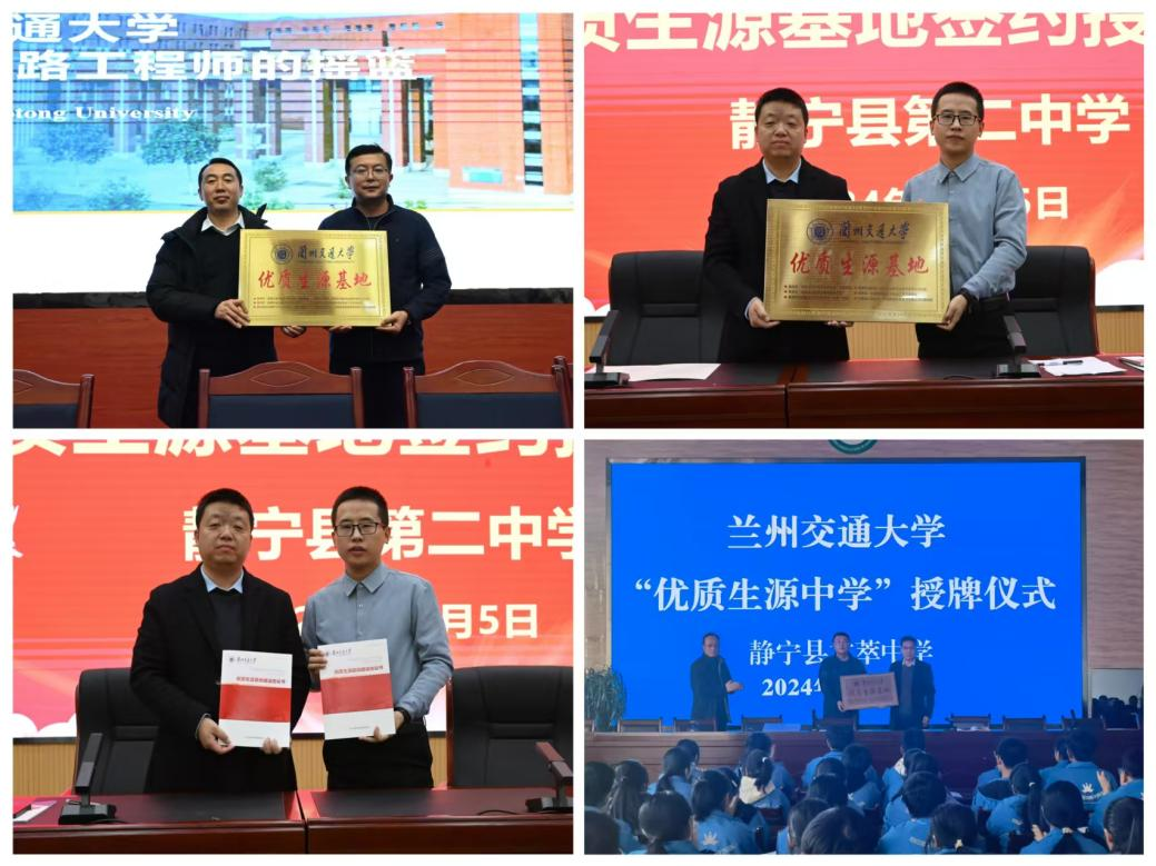 在本次招生宣传工作中,机电工程学院党委副书记、副院长朱俊敏与辅导员吴东亮代表分别为静宁县文萃中学、静宁县第二中学、庄浪县第一中学赠授了“兰州交通大学优质生源基地”牌匾,并与三所生源中学签署了“优质生源基地建设协议书”,标志着兰州交通大学与上述各中学正式建立了优质生源基地合作关系。招宣工作组与各中学校领导、相关职能部门负责人进行了亲切座谈,对学校进行了全面宣传推介,双方表示将进一步加强合作与交流,共同构建招生宣传的长效机制。