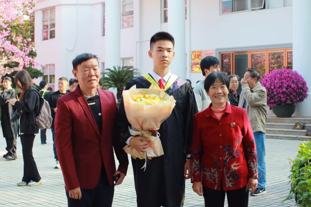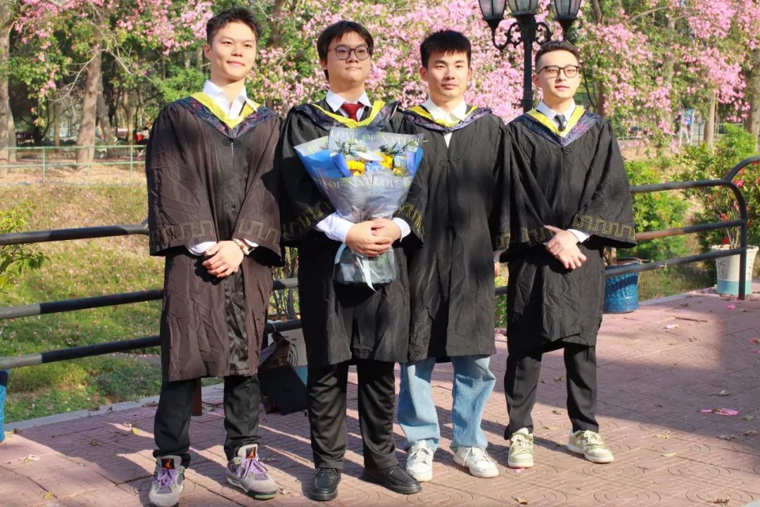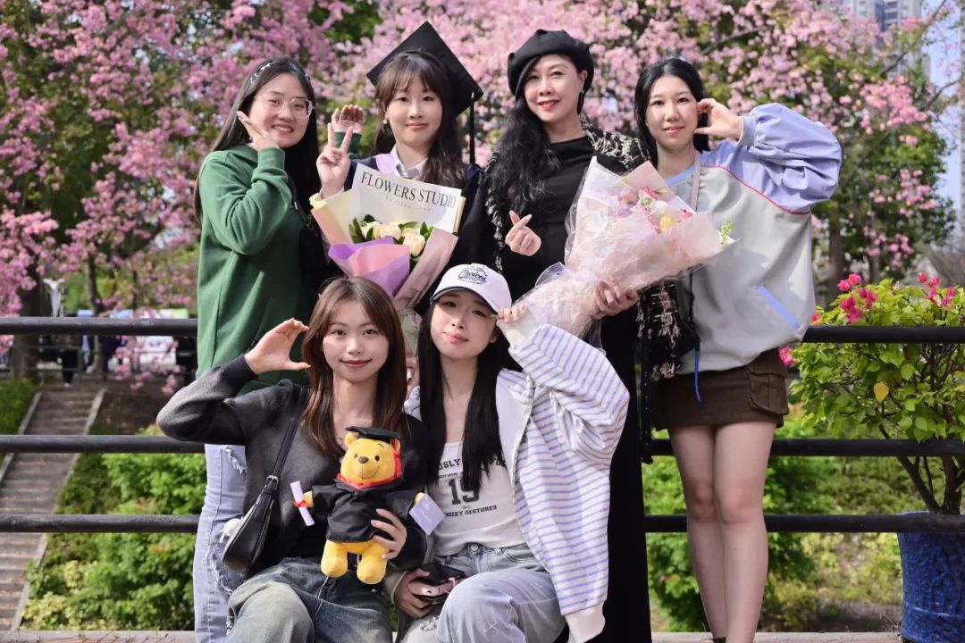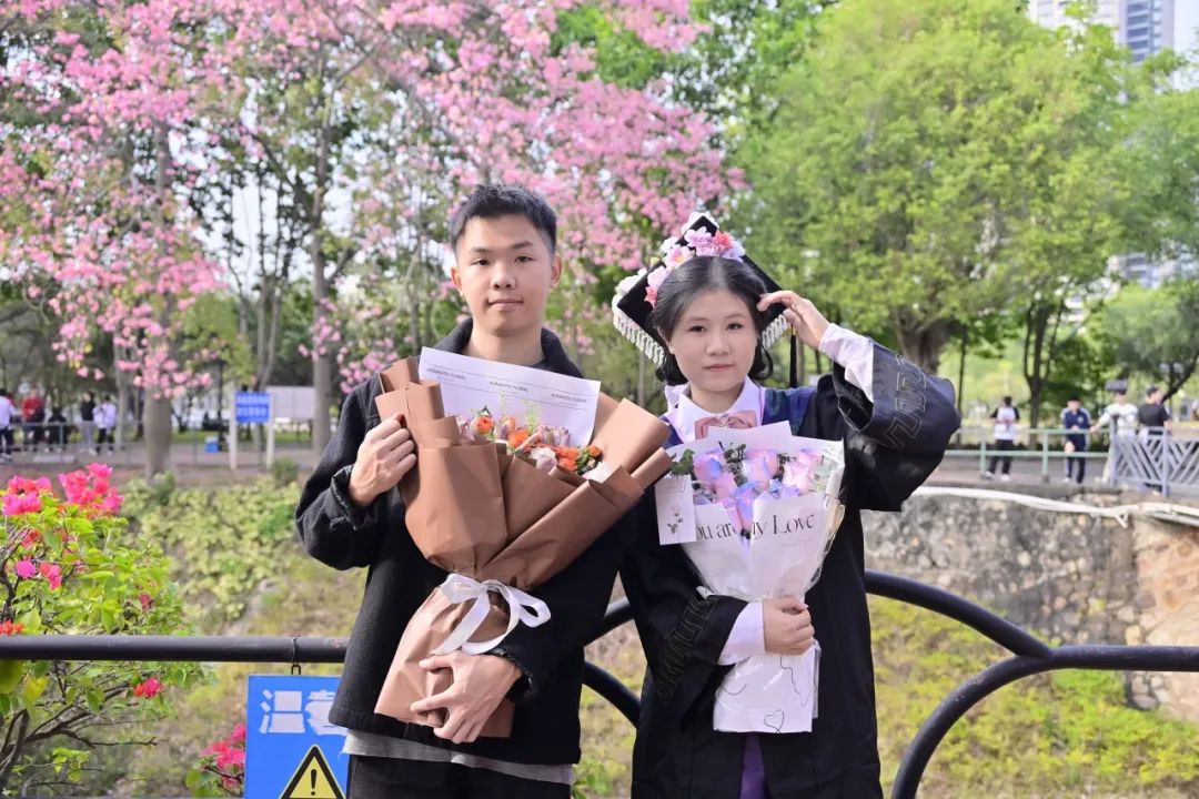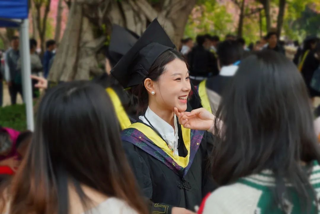 在“白宫”前,在弘桥上,在丝木棉下,毕业班的同学们身着学士服,头戴学士帽,手捧鲜花,三两好友轻松交谈、或与同学亲密留影。灿烂的阳光透过云层洒在每个人的脸上,为这特别的时刻增添了几分温暖和庄重。整个校园热闹有序,洋溢着青春的气息。