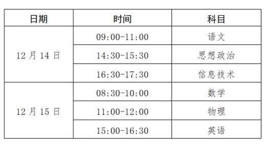 本次考试开考语文、思想政治、信息技术、数学、物理、