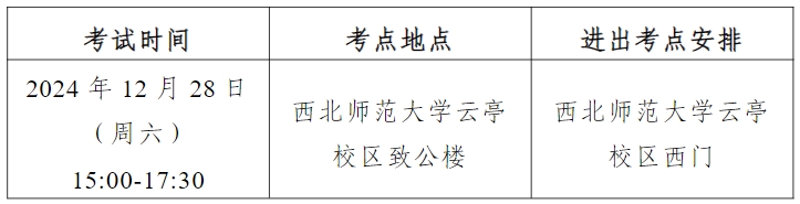 笔试考点设在西北师范大学云亭校区(地址:兰州市安宁区安宁东路967号)。面试考点设在西北师范大学知行校区(地址:兰州市安宁区邱家湾37号)。
